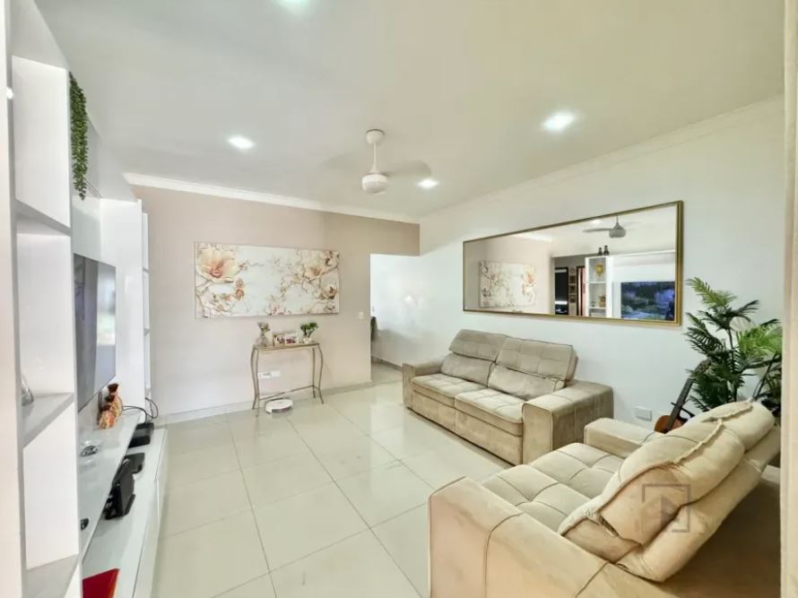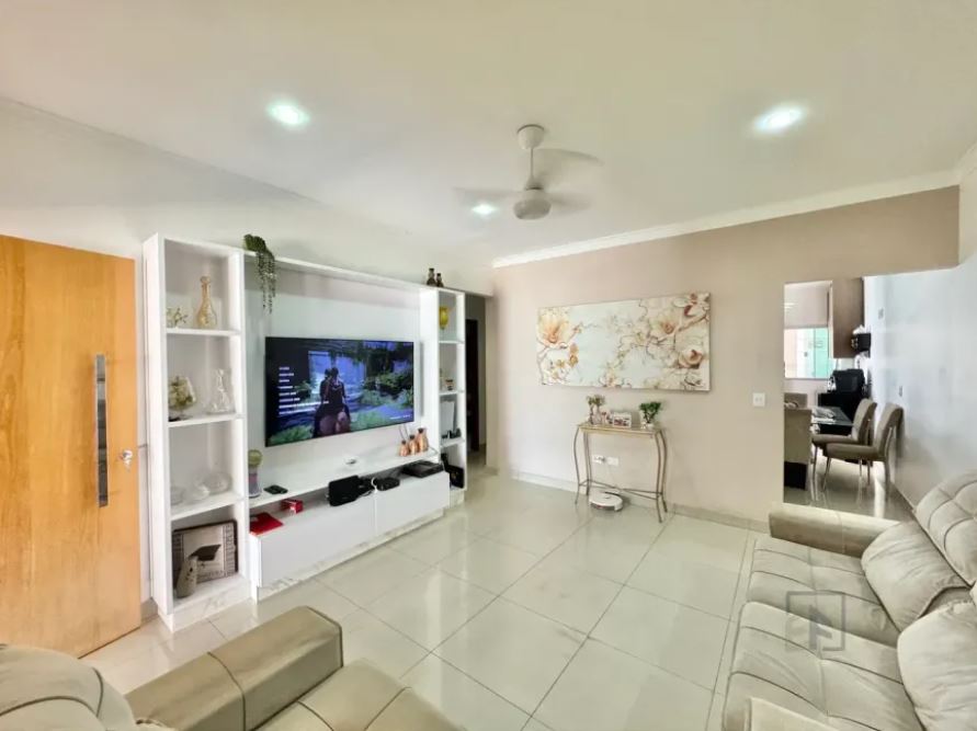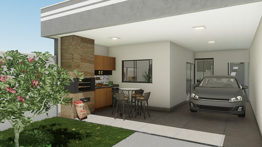 Ampla sala de TV e cozinha, 3 quartos sendo uma suíte, banheiro social, varanda gourmet com churrasqueira a carvão, área de serviço coberta, deposito e lavabo; Vaga de garagem coberta e Armários planejados na cozinha.