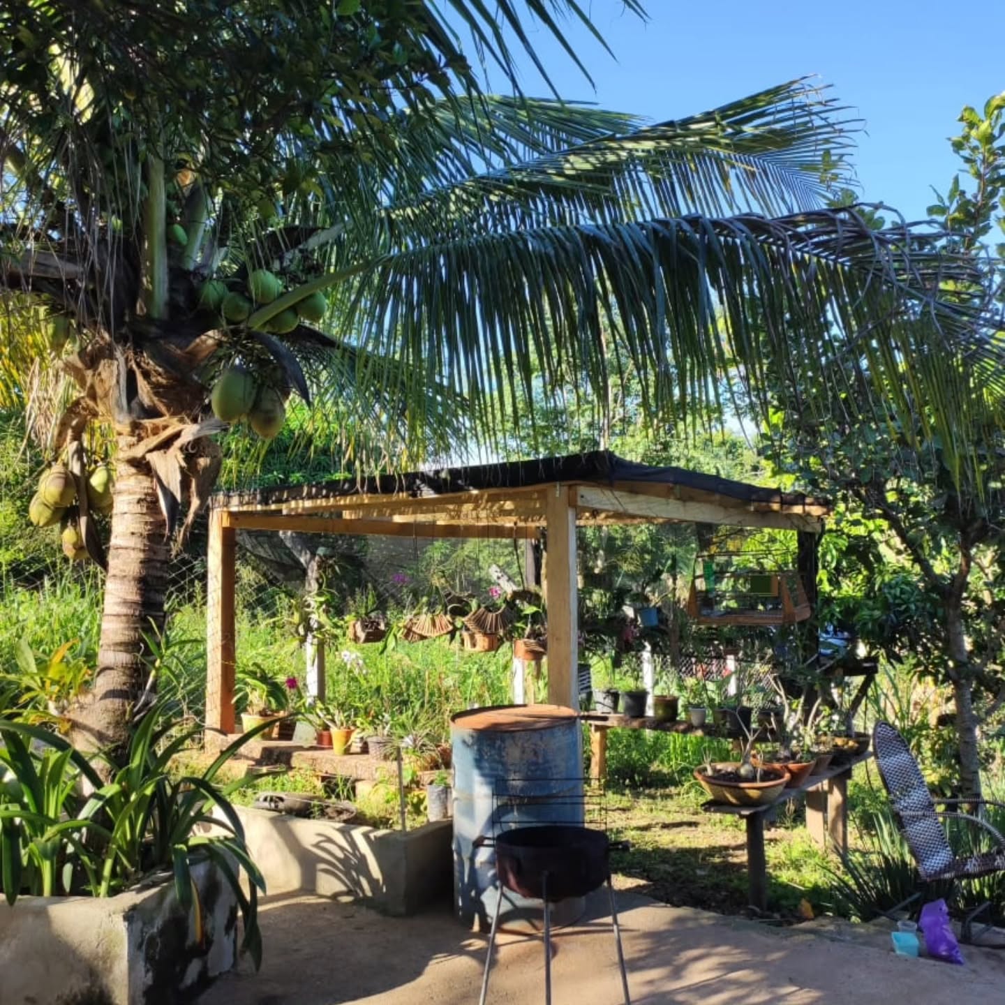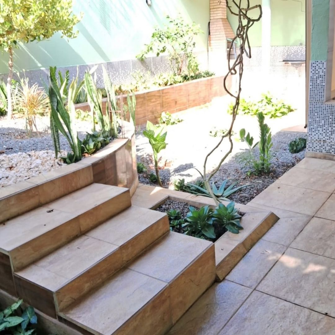 – Jardim com pergolato e quintal com sombreiros 🌿